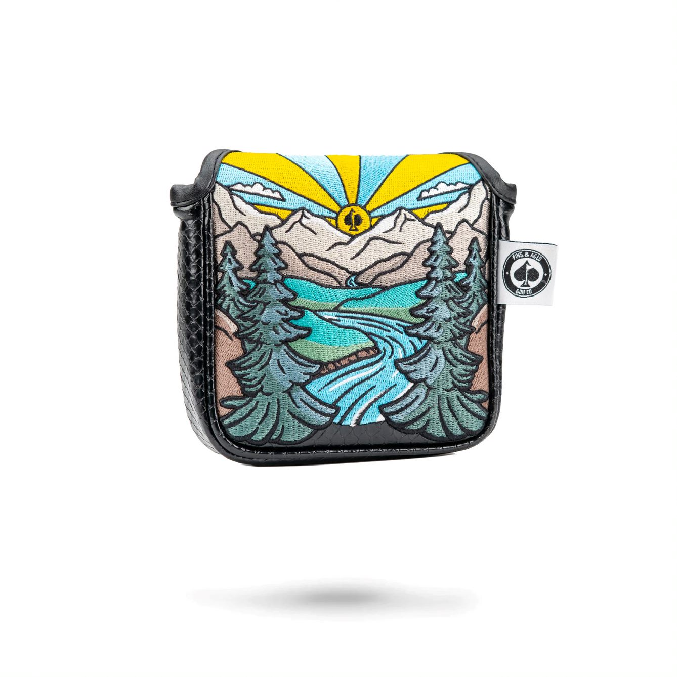 "The Rockies mallet cover featuring a scenic mountain design and durable fabric, suitable for protecting golf club putters."