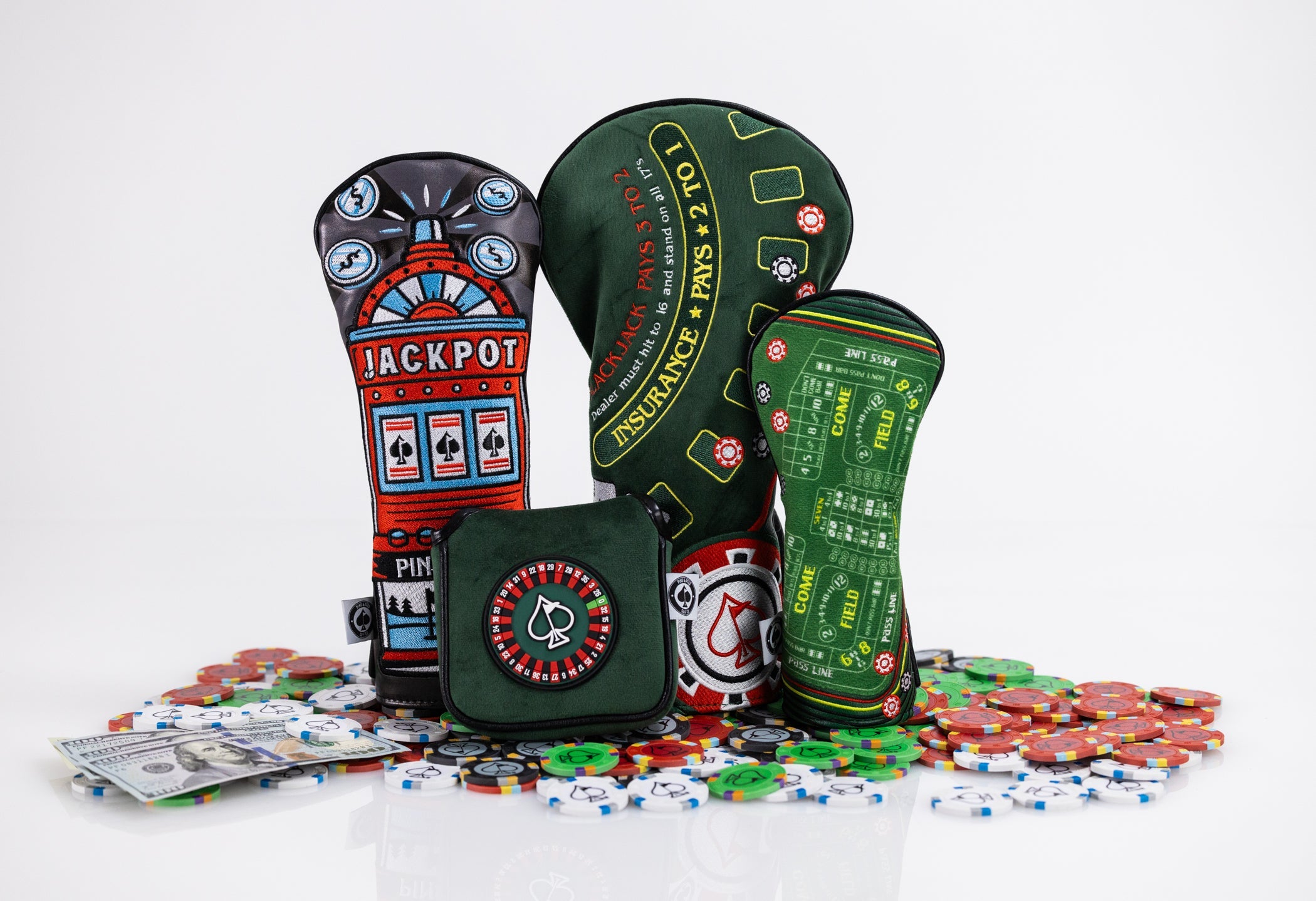 Hybrid golf club headcover featuring a craps casino theme with dice and card designs.
