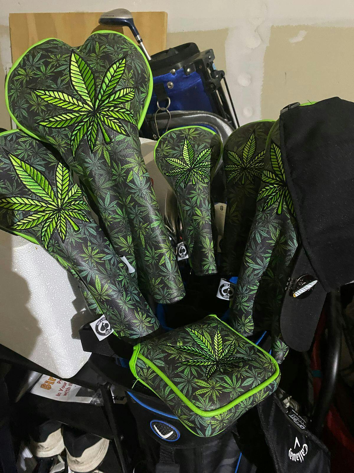 Bold fairway cover featuring a vibrant green cannabis leaf design on a black background, perfect for high handicap golfers.
