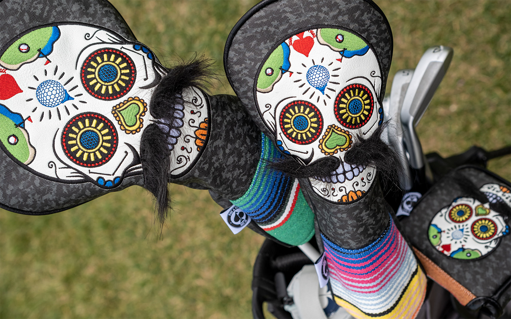 Stylize and customize the look of your golf bag with this high quality, hand-made putter headcover. Featuring hand sewn panels and faux mustache with embroidered Sugar Skull design. The lower part of this cover is made from an authentic Mexican blanket. NOTE: each cover will be unique with a different cut of the blanket.