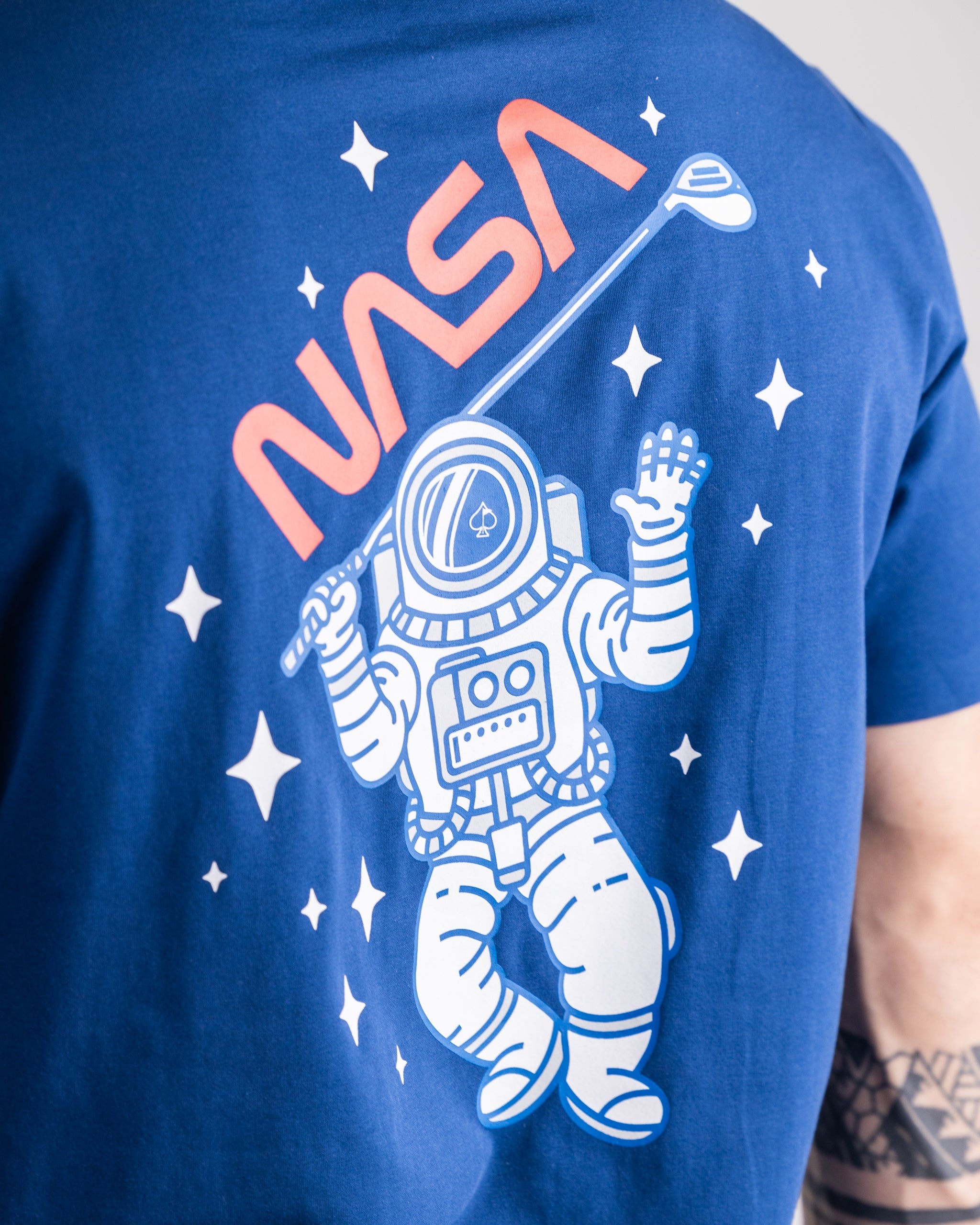 NASA-themed T-shirt featuring the iconic logo on a navy blue background.