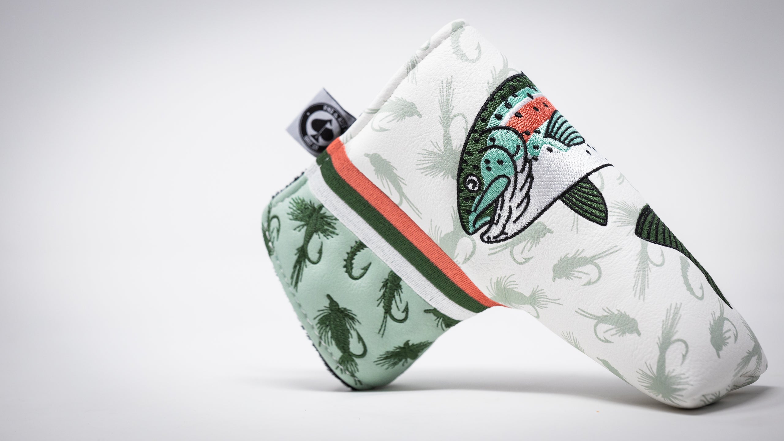 Trout Blade Putter Cover featuring a vibrant trout design with a sleek, protective fit for golf putters.